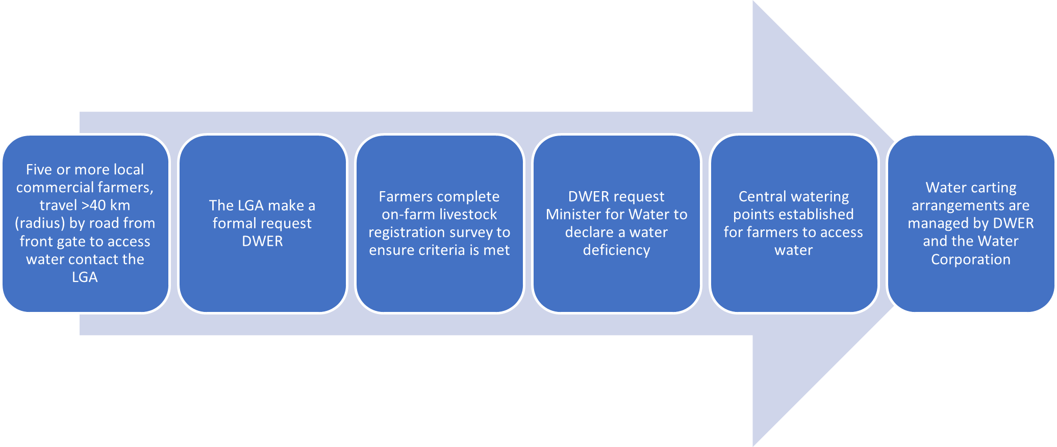 A declaration occurs when a group of five or more farmers, within a 20 kilometre radius, require water from an off-farm source and have to travel greater than a 40 kilometre radius from their farm to the source. In extreme circumstances, water may be provided for individual famers.
