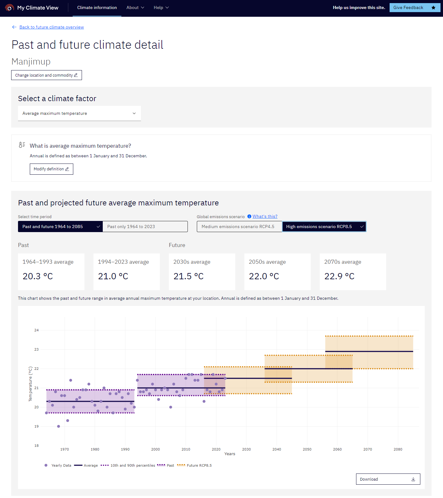 My Climate View provides summary data and visualisations that combine historical data and projections for selected locations and agriculture-relevant climate variables.